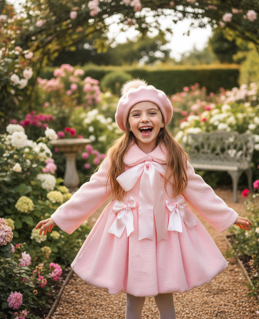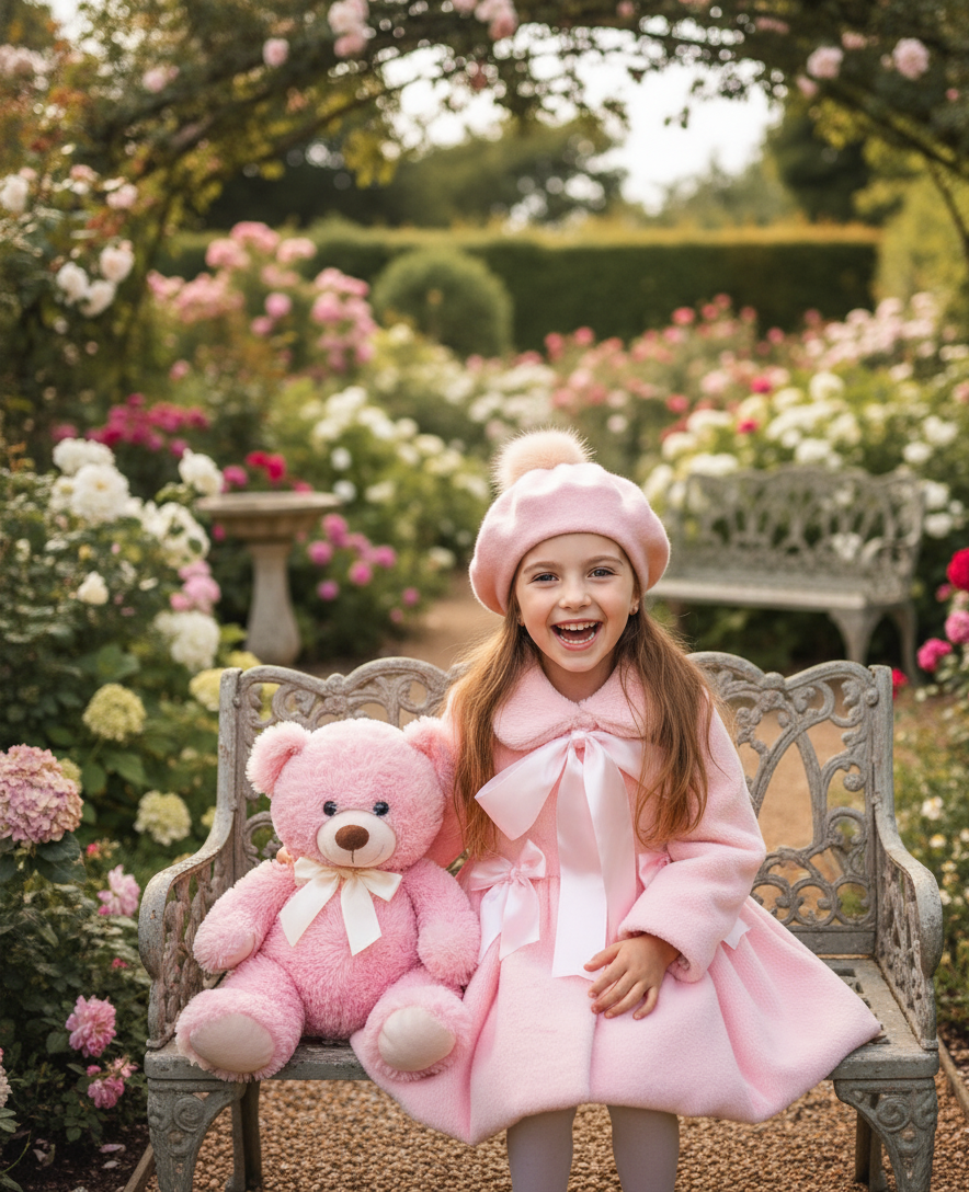Perfecto para combinar con vestidos o looks más informales, el abrigo Osita Rosa se puede completar con una boina a juego de pelo rosa con un adorable pompón en color marfil, creando un conjunto irresistible para las pequeñas más estilosas.