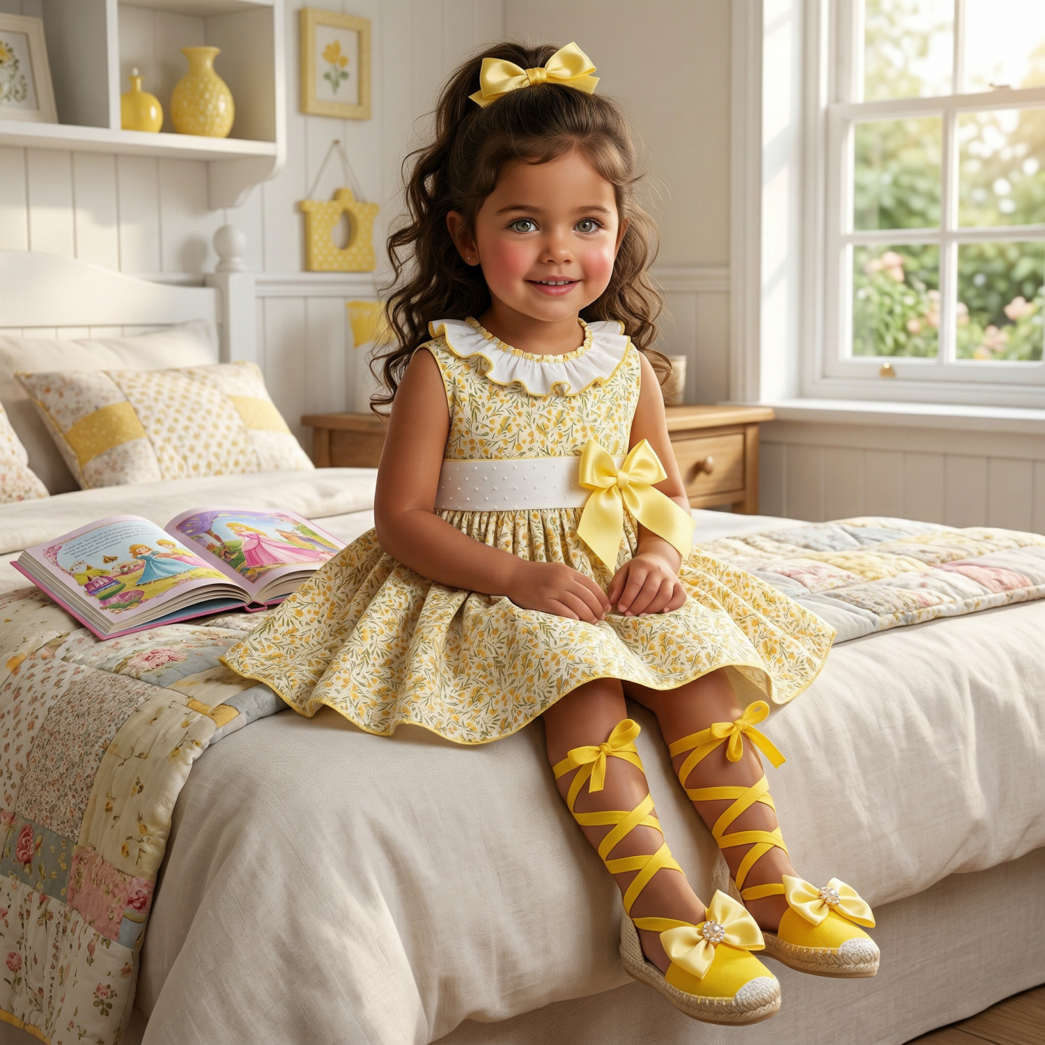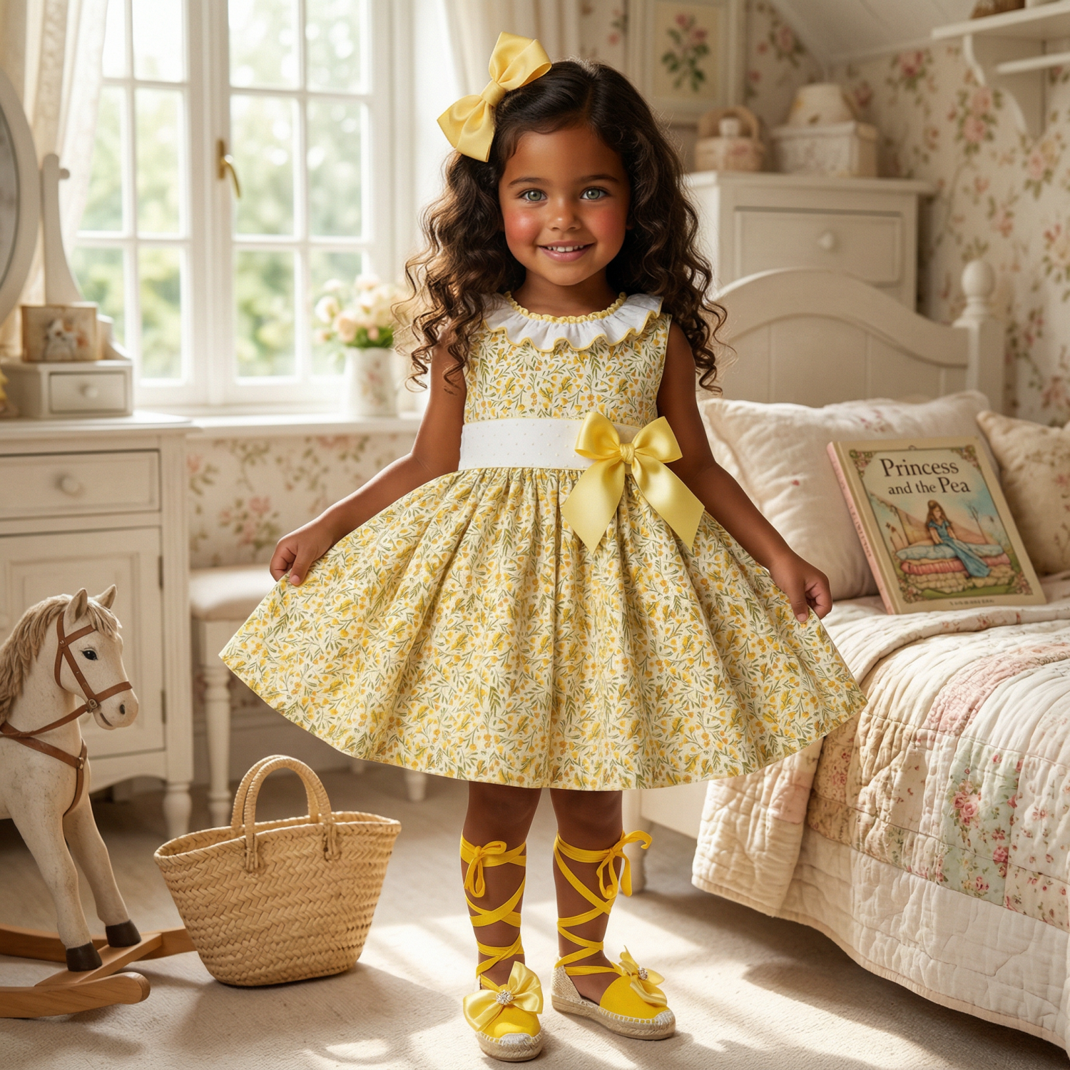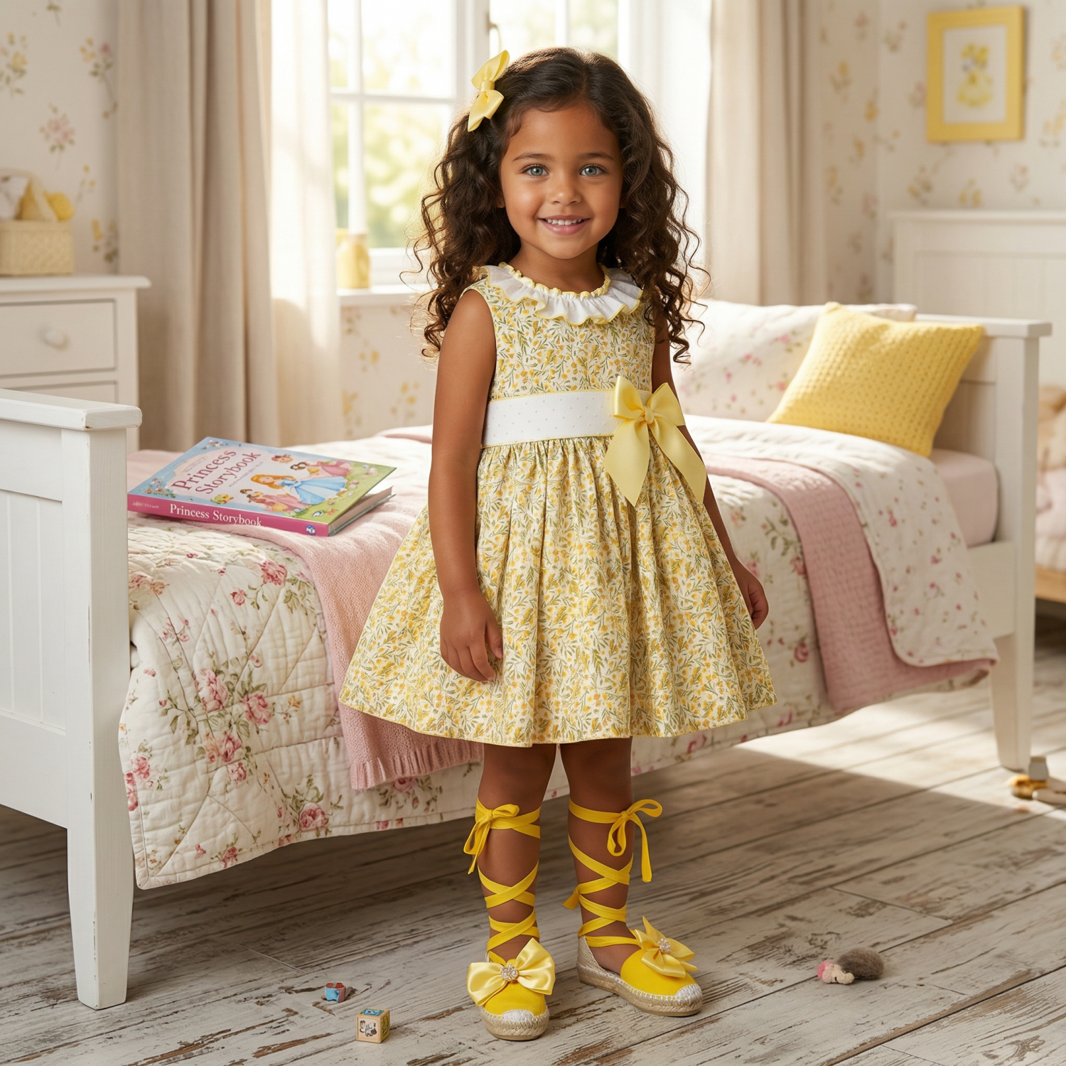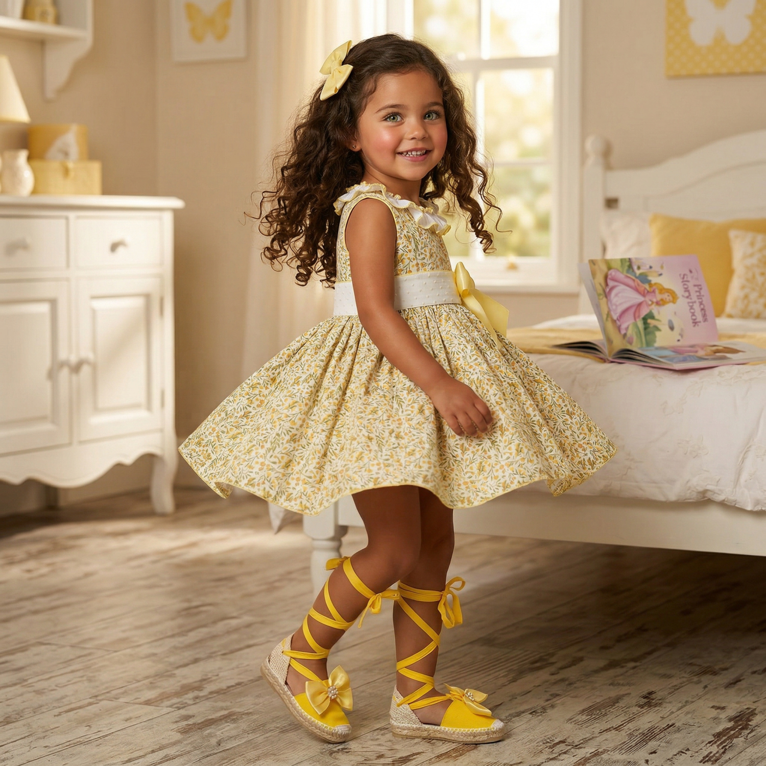 Fresh and lightweight girls’ summer dress made from soft cotton fabric in a delicate yellow floral print. Its comfortable and charming design makes it a perfect choice for warmer days. It features beautiful soft yellow dotted plumeti on the waistband and neckline, adding a sweet and elegant finishing touch. The side bow brings an extra special and feminine detail, creating a refined and lovely childrenswear look.