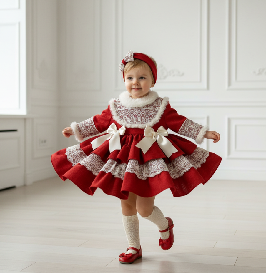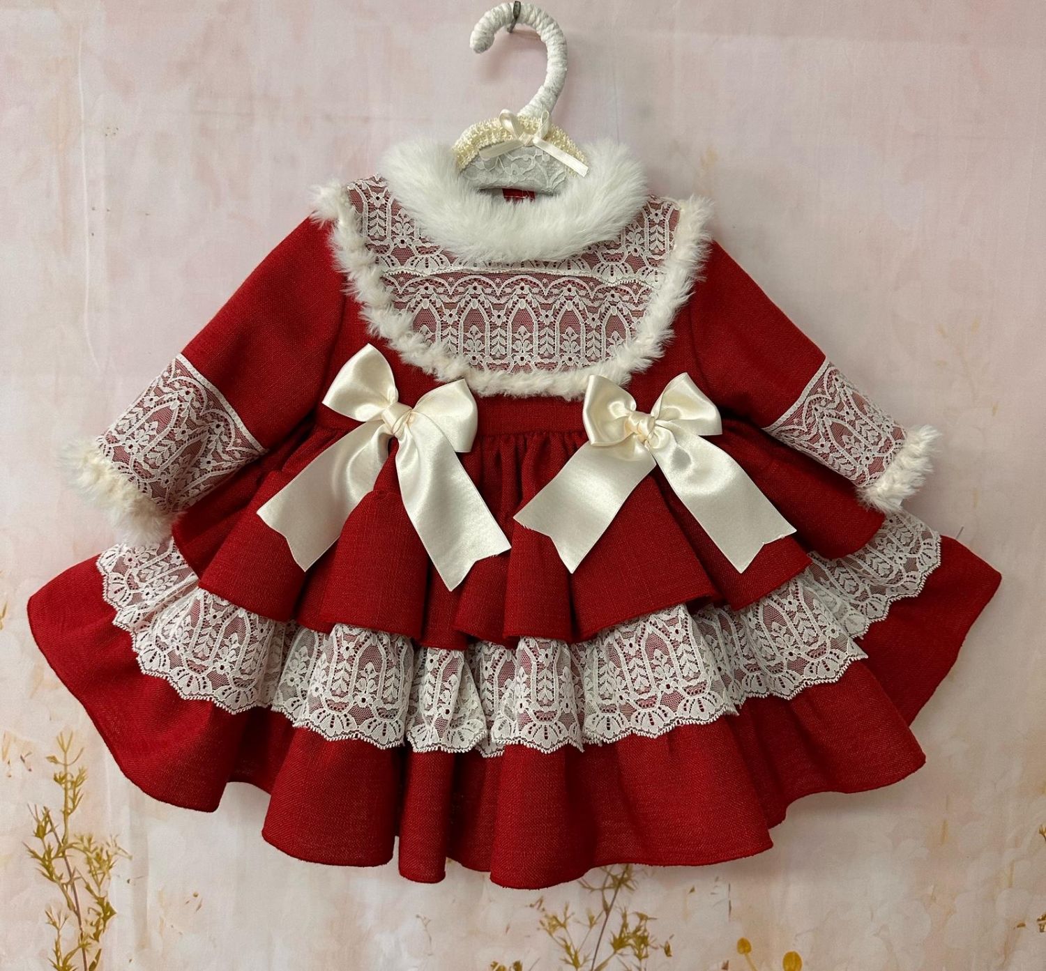 IN25-06 VESTIDO ROJO CON ENCAJE Y detalles DE PELO en cuello y manga